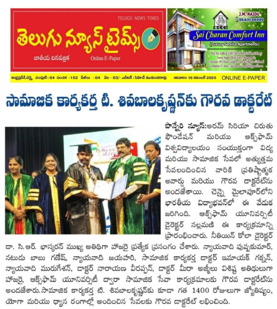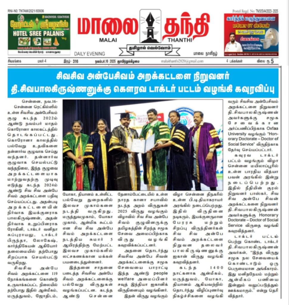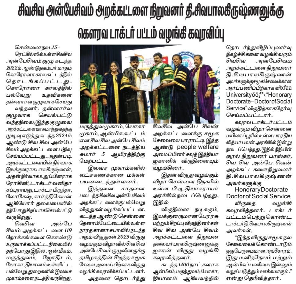 ரெட்ஹில்ஸை தலைமையிடமாகக் கொண்டு செயல்பட்டு வரும் சிவசிவ அன்பே சிவம் அறக்கட்டளை நிறுவனர் மற்றும் சமூக சேவையாளர் தி. சிவபாலகிருஷ்ணன் அவர்களுக்கு, சமூக சேவையில் அவரின் நீண்டகால அர்ப்பணிப்பை பாராட்டி “Honorary Doctorate – Doctor of Social Service” என்ற கௌரவ டாக்டர் பட்டம் வழங்கப்பட்டது.